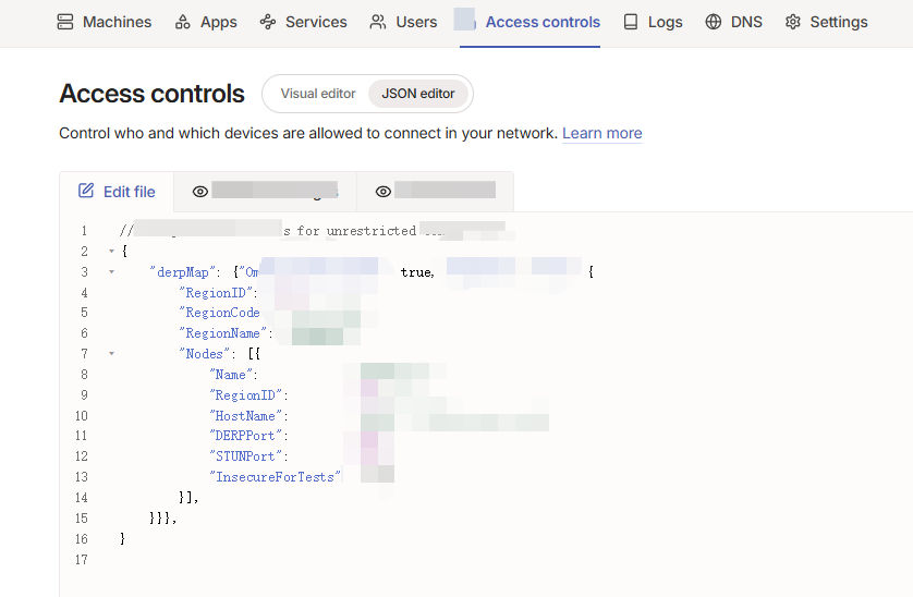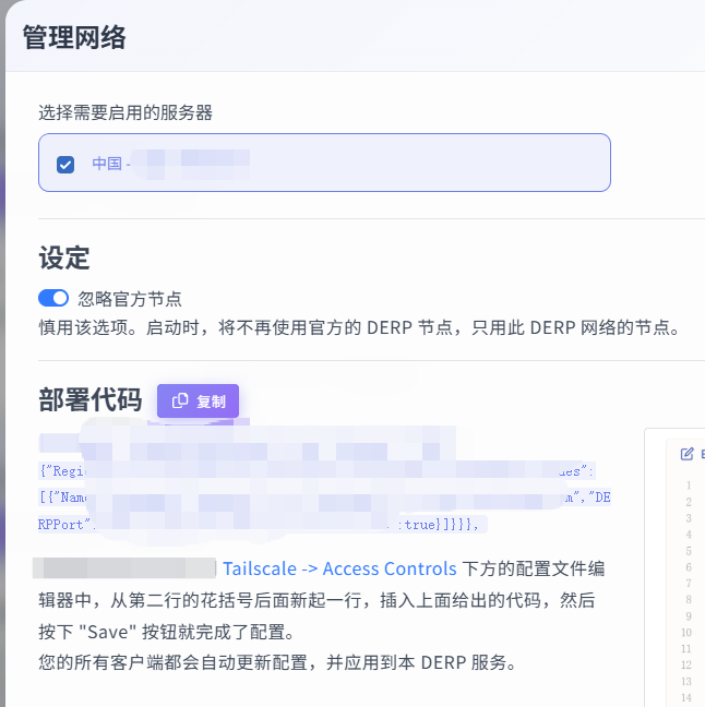 使用非常简单:在微林后端创建一个网络,复制部署代码到tailscale里Access Controls里即可,如图。